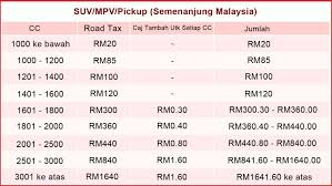 Harga Roadtax Kenderaan di Malaysia Cara u0027Renewu0027 Roadtax atau Pembaharuan Cukai Jalan dan Insurans. RM160 untuk setiap perbezaan CC berbanding 3000cc. Jadi pastikan anda hanya failkan tuntutan insurans kereta jika kos pembaikan lebih tinggi.